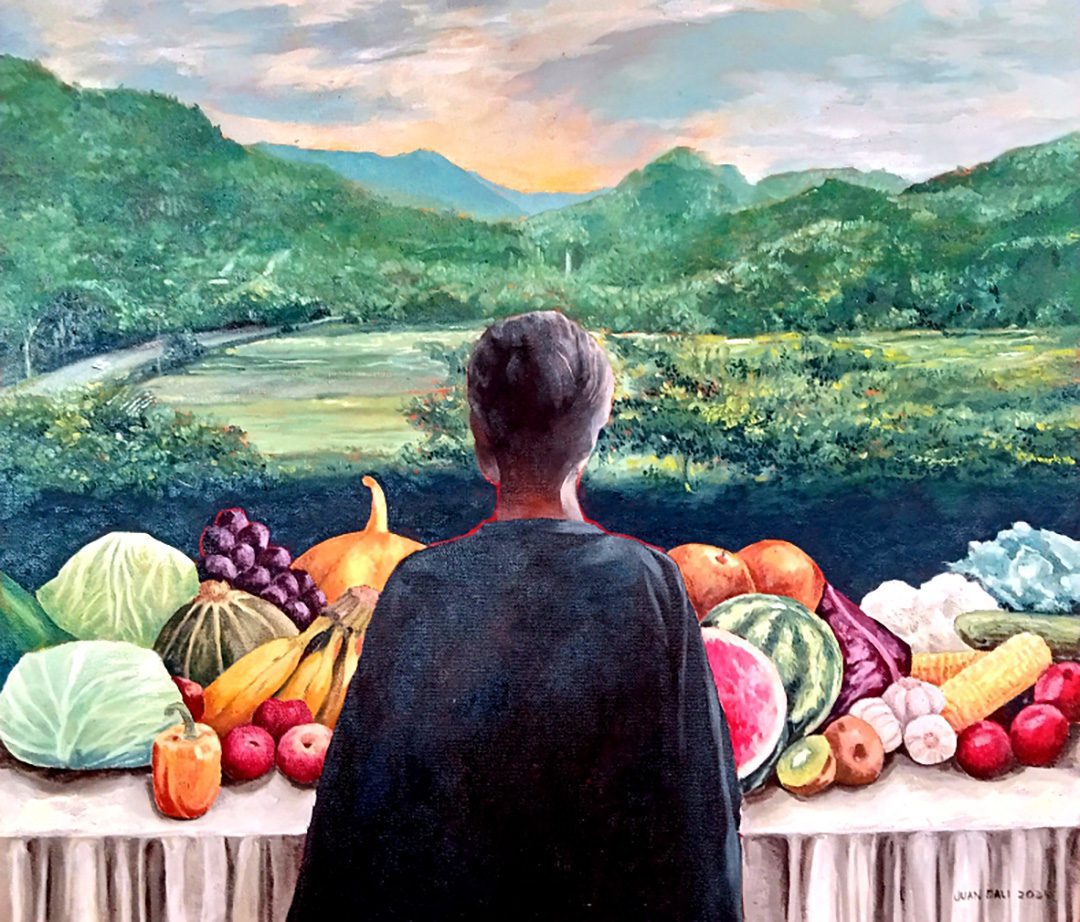 Melalui sapuan warna yang jujur dan puitis, Juan menggambarkan bentang alam yang subur dan tenang, dengan bukit-bukit yang merunduk dalam cahaya, ladang yang membentang, dan langit yang memeluk bumi. Di tengah lanskap itu, tergambar sebuah meja panjang yang dipenuhi hasil bumi: buah-buahan, umbi, biji-bijian—semuanya berasal dari tanah Menoreh. Meja ini menjadi simbol kemakmuran, ketersediaan pangan, dan keberlimpahan yang bersumber dari hubungan harmonis antara manusia dan alam.